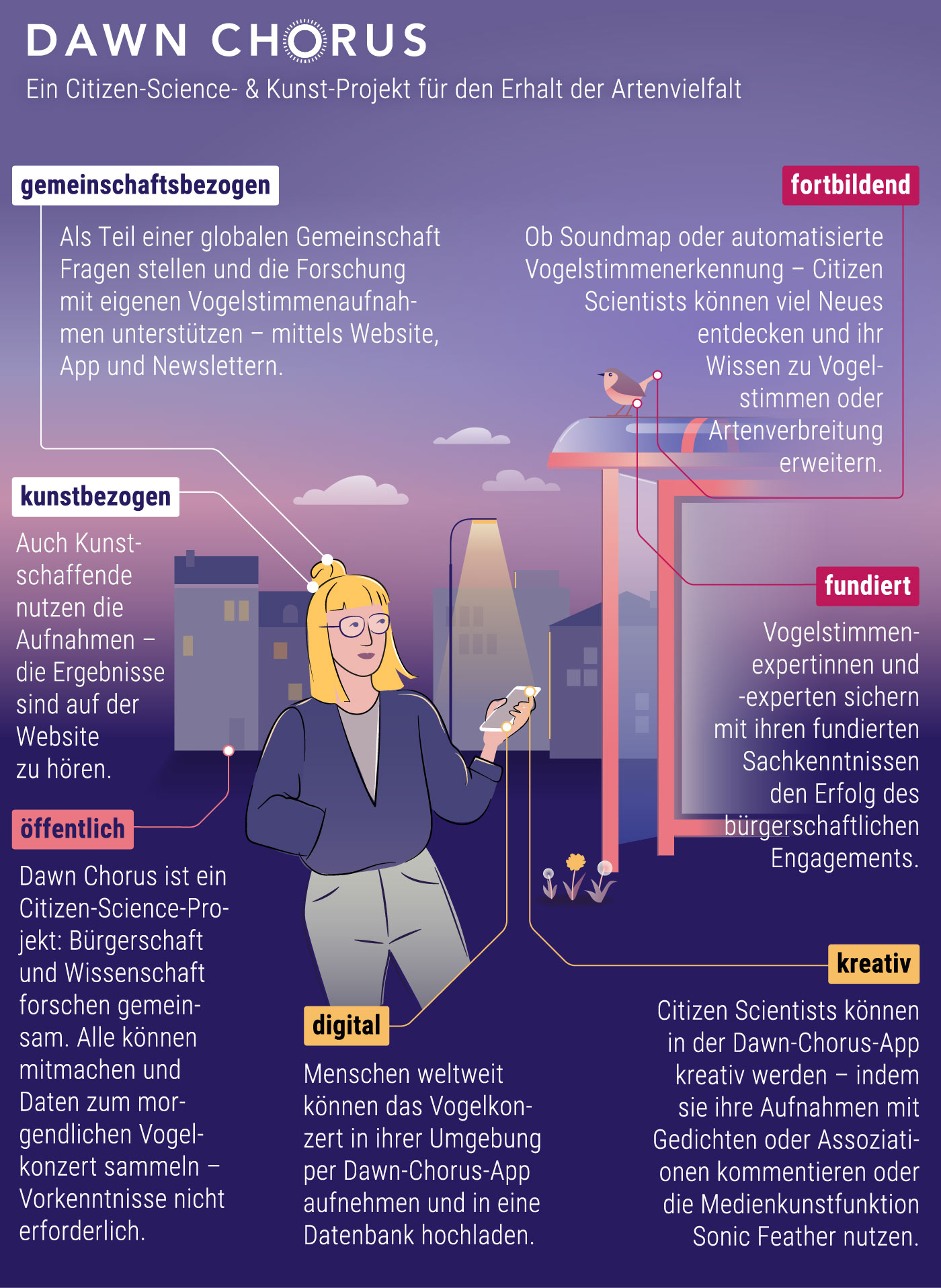 Dawn Chorus lebt als Citizen-Science-Projekt davon, dass engagierte Bürgerwissenschaftler:innen wie Ihr Aufnahmen in großer Zahl beitragen, damit eine solide Datengrundlage entsteht. Aber auch bei der Datenanalyse könnt Ihr Dawn Chorus unterstützen. Keine Wissenschaftlerin und kein Wissenschaftler wäre alleine in der Lage, gleichzeitig und wiederholt über viele Jahre hinweg Aufnahmen aus Bayern, ganz Europa und sogar der ganzen Welt zu sammeln. Folgende Infografik veranschaulicht, wie Bürger:innen, Forschende, Vogelstimmenexpert:innen und Kunstschaffende bei Dawn Chorus für den Erhalt der Artenvielfalt zusammenarbeiten.